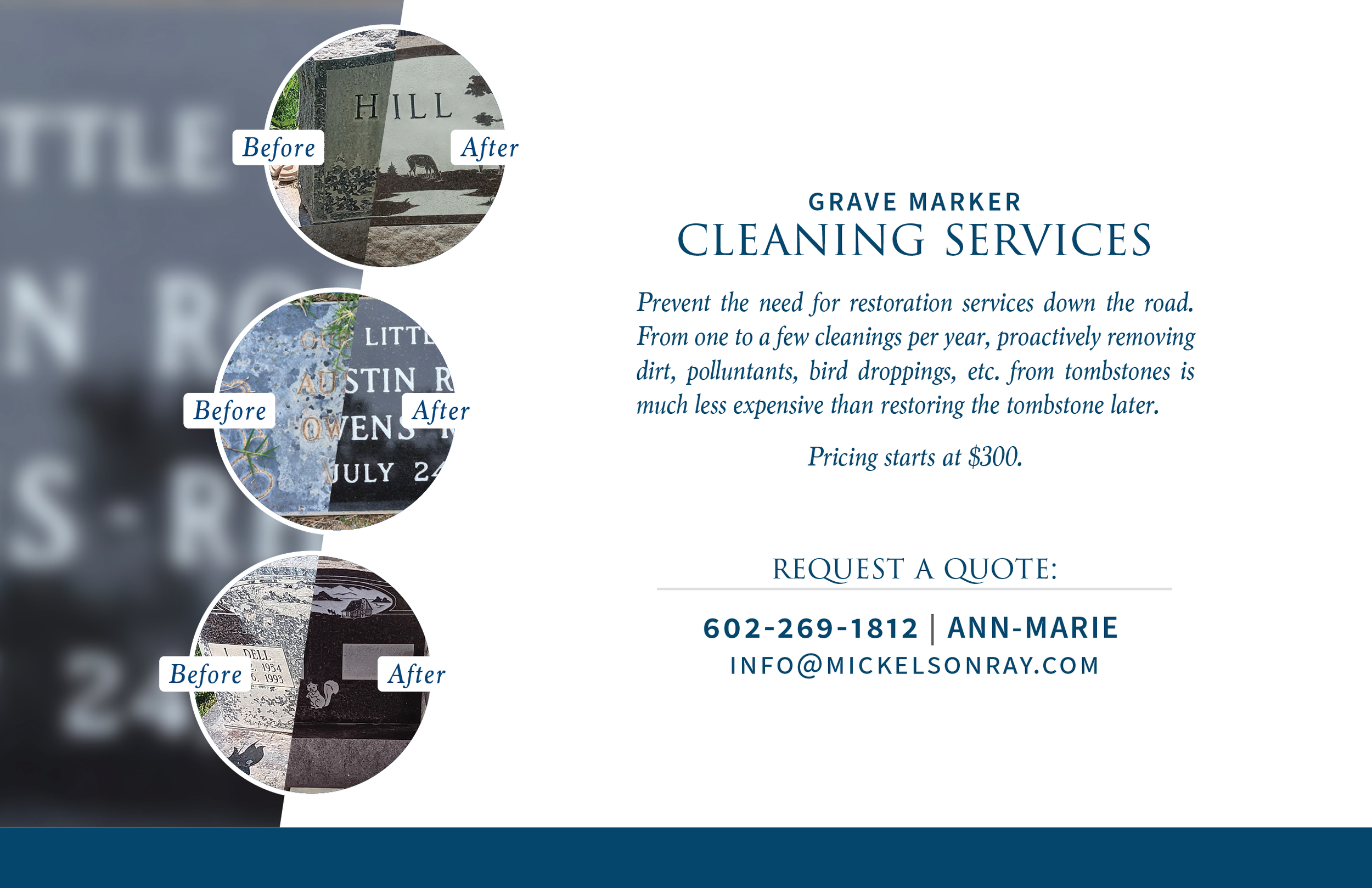 Prevent the need for restoration services down the road. From one to a few cleanings per year, proactively removing dirt, pollutants, bird droppings, etc. from tombstones is much less expensive than restoring the tombstone later.